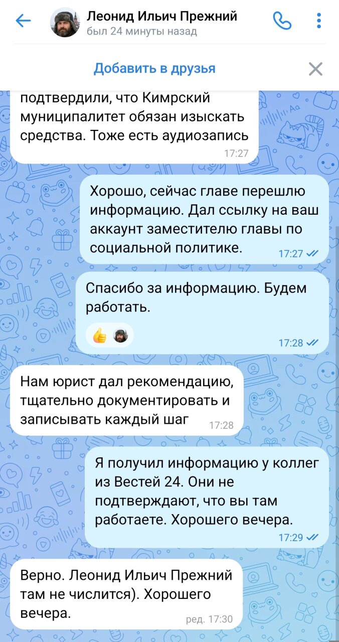 Через несколько минут переписки стало ясно, что это фейковый аккаунт: с него пытаются разместить вымышленные скандальные новости про Кимры.